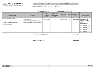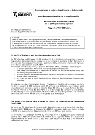 Dans le cadre de sa politique patrimoniale, le Département a souhaité mettre en place des centres d'interprétation du patrimoine afin de permettre aux publics de s'approprier l'histoire de leur territoire, de favoriser sa transmission et la valoriser. Le présent rapport porte sur l'aide financière du Conseil Général au CIP d'Andlau qui s'inscrit pleinement dans ce contexte.
