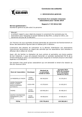 Le présent rapport a pour objet de proposer le versement d’un acompte pour les associations pour lesquelles le Conseil Général du Bas-Rhin, a alloué en 2013, une subvention de plus de 23 000,00 €.