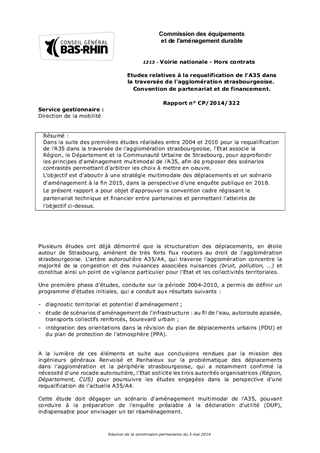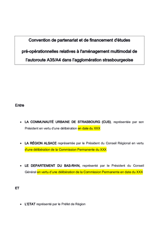 Dans la suite des premières études réalisées entre 2004 et 2010 pour la requalification de l'A35 dans la traversée de l'agglomération strasbourgeoise, l'Etat associe la Région, le Département et la Communauté Urbaine de Strasbourg, pour approfondir les principes d'aménagement multimodal de l'A35, afin de proposer des scénarios contrastés permettant d'arbitrer les choix à mettre en oeuvre. L'objectif est d'aboutir à une stratégie multimodale des déplacements et un scénario d'aménagement à la fin 2015, dans la perspective d'une enquête publique en 2018. Le présent rapport a pour objet d'approuver la convention cadre régissant le partenariat technique et financier entre partenaires et permettant l'atteinte de l'objectif ci-dessus.
