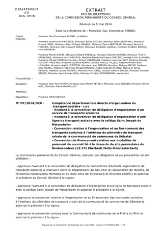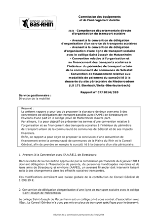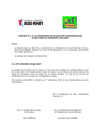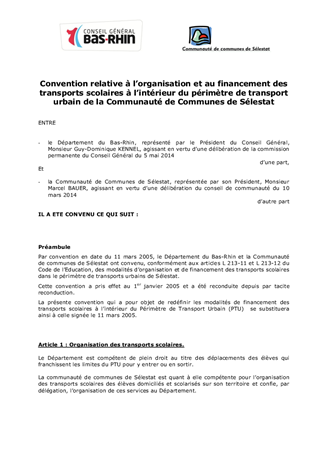 - Avenant à la convention de délégation d'organisation d'un service de transports scolaires - Avenant à la convention de délégation d'organisation d'une ligne de transport scolaire avec le collège Saint Joseph de Matzenheim - Convention relative à l'organisation et au financement des transports scolaires à l'intérieur du périmètre de transport urbain de la communauté de communes de Sélestat - Convention de financement relative aux modalités de paiement du surcoût lié à la desserte du site périscolaire de Niederroedern (LS 171 Eberbach/Seltz-Oberlauterbach)