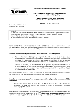 En matière d'éducation et de formation, le Conseil Général accompagne les collectivités et apporte son soutien aux travaux d'investissement réalisés dans les écoles maternelles et élémentaires publiques. Le présent rapport soumet à votre approbation 5 dossiers.