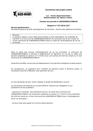 Le présent rapport a pour objet de soumettre à votre approbation les modalités de transfert à la commune de LANGENSOULTZBACH d'une parcelle de terrain située sur le ban communal de LANGENSOULTZBACH dans le cadre de l'aménagement de sa rue principale.