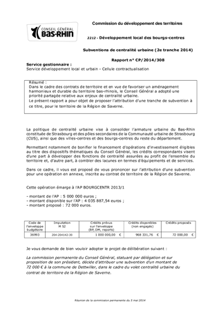 Dans le cadre des contrats de territoire et en vue de favoriser un aménagement harmonieux et durable du territoire bas-rhinois, le Conseil Général a adopté une priorité partagée relative aux enjeux de centralité urbaine. Le présent rapport a pour objet de proposer l'attribution d'une tranche de subvention à ce titre, pour le territoire de la Région de Saverne.