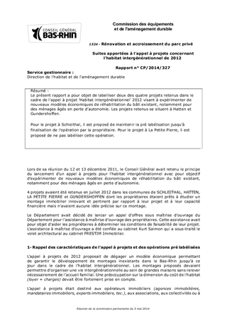 Le présent rapport a pour objet de labelliser deux des quatre projets retenus dans le cadre de l'appel à projet 'Habitat intergénérationnel' 2012 visant à expérimenter de nouveaux modèles économiques de réhabilitation du bâti existant, notamment pour des ménages âgés en perte d’autonomie. Les projets retenus se situent à Hatten et Gundershoffen. Pour le projet à Schleithal, il est proposé de maintenir la pré labélisation jusqu’à finalisation de l’opération par la propriétaire. Pour le projet à La Petite Pierre, il est proposé de ne pas labéliser cette opération.