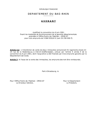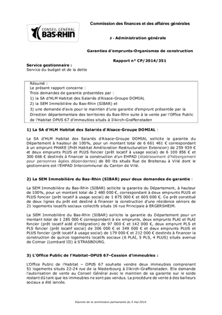 Le présent rapport concerne : Trois demandes de garantie présentées par : 1) la SA d’HLM Habitat des Salariés d’Alsace-Groupe DOMIAL 2) la SEM Immobilière du Bas-Rhin (SIBAR) et 3) une demande d’avis pour le maintien d’une garantie d’emprunt présentée par la Direction départementale des territoires du Bas-Rhin suite à la vente par l’Office Public de l’Habitat OPUS 67 d’immeubles situés à Illkirch-Graffenstaden