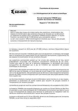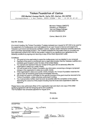 Dans le cadre des travaux de modernisation des expositions, d’optimisation des espaces et d’amélioration des conditions d’accueil du Vaisseau qui se dérouleront en septembre et octobre 2014, la fondation TIMKEN souhaite apporter un soutien financier à la collectivité de 73 500 dollars sans contrepartie aucune. Le don vise à soutenir l’effort d’aménagement d’alcôves pour l’accueil des groupes scolaires à l’emplacement de l’actuelle boutique.