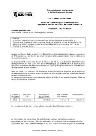 Le présent rapport concerne la demande de subvention départementale de la Commune de Krautergersheim pour une étude de faisabilité en vue de la création de logements locatifs sociaux et/ou d'un pôle médical dans un immeuble sis 7 rue de l'Ecole à Krautergersheim.