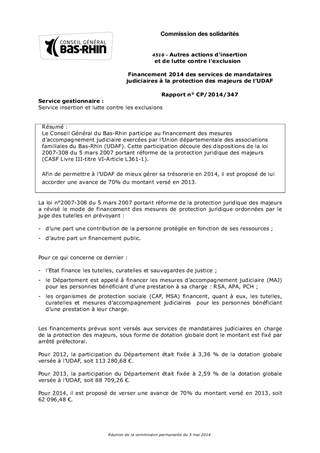 Le Conseil Général du Bas-Rhin participe au financement des mesures d’accompagnement judiciaire exercées par l’Union départementale des associations familiales du Bas-Rhin (UDAF). Cette participation découle des dispositions de la loi 2007-308 du 5 mars 2007 portant réforme de la protection juridique des majeurs (CASF Livre III-titre VI-Article L361-1). Afin de permettre à l’UDAF de mieux gérer sa trésorerie en 2014, il est proposé de lui accorder une avance de 70% du montant versé en 2013.