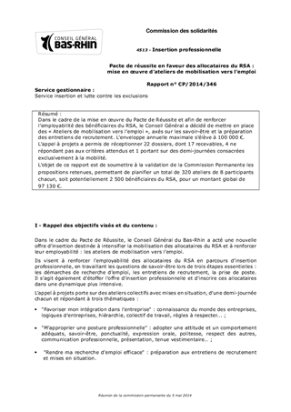 Dans le cadre de la mise en œuvre du Pacte de Réussite et afin de renforcer l’employabilité des bénéficiaires du RSA, le Conseil Général a décidé de mettre en place des « Ateliers de mobilisation vers l’emploi », axés sur les savoir-être et la préparation des entretiens de recrutement. L’enveloppe annuelle maximale s’élève à 100 000 €. L’appel à projets a permis de réceptionner 22 dossiers, dont 17 recevables, 4 ne répondant pas aux critères attendus et 1 portant sur des demi-journées consacrées exclusivement à la mobilité. L’objet de ce rapport est de soumettre à la validation de la Commission Permanente les propositions retenues, permettant de planifier un total de 320 ateliers de 8 participants chacun, soit potentiellement 2 500 bénéficiaires du RSA, pour un montant global de 97 130 €.