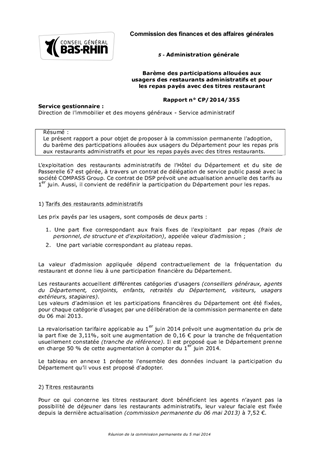 Le présent rapport a pour objet de proposer à la commission permanente l'adoption, du barème des participations allouées aux usagers du Département pour les repas pris aux restaurants administratifs et pour les repas payés avec des titres restaurants.