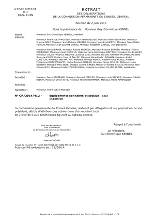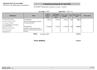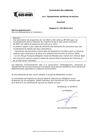 Une autorisation de programme de 121 000 € a été votée au BP 2014 pour les investissements dans le domaine de l'insertion et de la lutte contre l'exclusion. 90 000 € de crédits de paiement sont prévus en 2014. Le présent rapport a pour objet de présenter des demandes de subvention pour des investissements réalisés par deux associations : - l'association des Sauveteurs Secouristes de Niederbronn-les-Bains pour un achat de matériel radio nécessaire à la tenue d'un dispositif prévisionnel de secours (DPS), - la Croix Rouge Française délégation locale de Sélestat pour l'achat d'un véhicule léger afin de pouvoir assurer plusieurs postes de secours dans le domaine de l'insertion et de la lutte contre l'exclusion.
