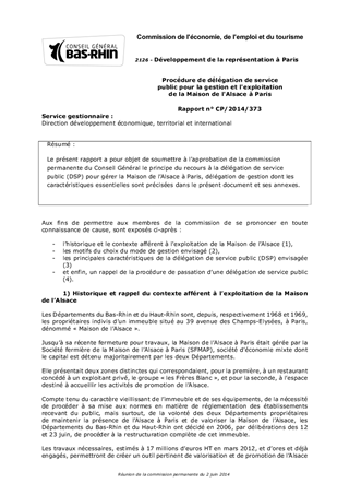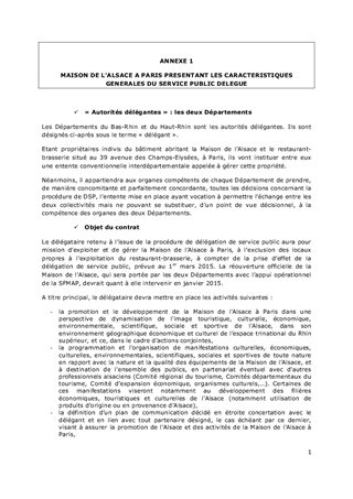 Le présent rapport a pour objet de soumettre à l’approbation de la commission permanente du Conseil Général le principe du recours à la délégation de service public (DSP) pour gérer la Maison de l’Alsace à Paris, délégation de gestion dont les caractéristiques essentielles sont précisées dans le présent document et ses annexes.