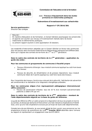 En matière d'éducation et de formation, le Conseil Général accompagne les collectivités et apporte son soutien aux travaux d'investissement réalisés dans les écoles maternelles et élémentaires publiques. Le présent rapport soumet à votre approbation 33 dossiers.
