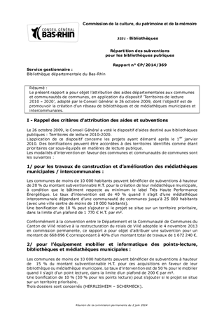 Le présent rapport a pour objet l’attribution des aides départementales aux communes et communautés de communes, en application du dispositif 'Territoires de lecture 2010 – 2020', adopté par le Conseil Général le 26 octobre 2009, dont l’objectif est de promouvoir la création d’un réseau de bibliothèques et de médiathèques municipales et intercommunales.