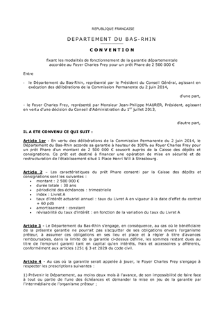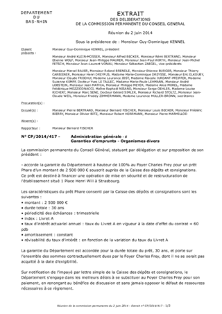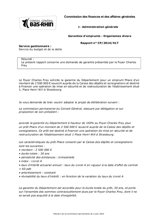 Garanties d’emprunts - Organismes divers Resumé Le présent rapport concerne une demande de garantie présentée par le Foyer Charles Frey Pièces jointes Délibération Rapport Convention Charles Frey.pdf Assemblée : Commission Permanente Date : 02/06/2014 Rapporteur : Monsieur Bernard FISCHER Collectivité : Conseil départemental du Bas-Rhin Direction : Direction des finances et de la commande publique Service : Service du budget et de la dette Domaine : Non renseigné Commission : M - Commission des finances et des affaires générales