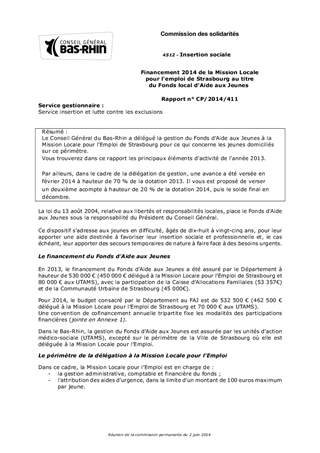 Le Conseil Général du Bas-Rhin a délégué la gestion du Fonds d’Aide aux Jeunes à la Mission Locale pour l’Emploi de Strasbourg pour ce qui concerne les jeunes domiciliés sur ce périmètre. Vous trouverez dans ce rapport les principaux éléments d’activité de l’année 2013. Par ailleurs, dans le cadre de la délégation de gestion, une avance a été versée en février 2014 à hauteur de 70 % de la dotation 2013. Il vous est proposé de verser un deuxième acompte à hauteur de 20 % de la dotation 2014, puis le solde final en décembre.
