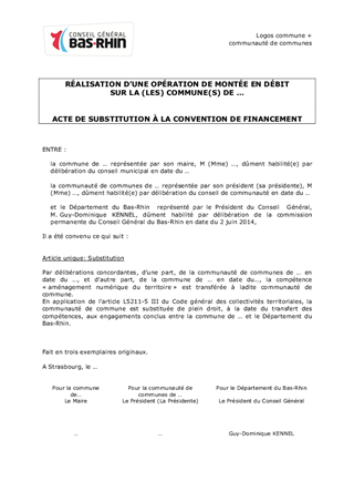 Le présent rapport complète le rapport du 3 février 2014, qui avait pour objet d’approuver le projet de convention financière à intervenir entre le Département du Bas-Rhin et les communes qui bénéficient d'une opération de montée en débit de la desserte internet, au cours de l'année. Ce rapport reprend les termes de la convention financière approuvée le 3 février, modifiée pour être conclue avec certaines communautés de communes qui disposent déjà d'un transfert de la compétence 'aménagement numérique du territoire'.