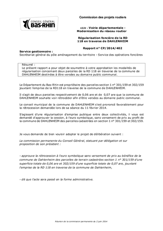 Le présent rapport a pour objet de soumettre à votre approbation les modalités de régularisation concernant deux parcelles de la RD 118 en traverse de la commune de DAHLENHEIM destinées à être versées au domaine public communal.