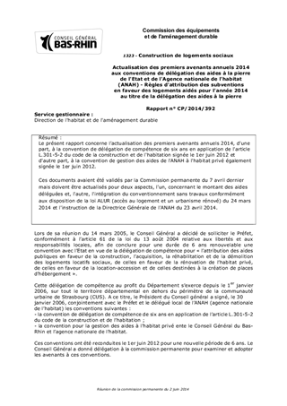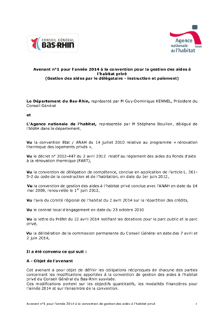 Le présent rapport concerne l'actualisation des premiers avenants annuels 2014, d'une part, à la convention de délégation de compétence de six ans en application de l'article L.301-5-2 du code de la construction et de l'habitation signée le 1er juin 2012 et d'autre part, à la convention de gestion des aides de l'ANAH à l'habitat privé également signée le 1er juin 2012. Ces documents avaient été validés par la Commission permanente du 7 avril dernier mais doivent être actualisés pour deux aspects, l'un, concernant le montant des aides déléguées et, l'autre, l'intégration du conventionnement sans travaux conformément aux disposition de la loi ALUR (accès au logement et un urbanisme rénové) du 24 mars 2014 et l'instruction de la Directrice Générale de l'ANAH du 23 avril 2014.
