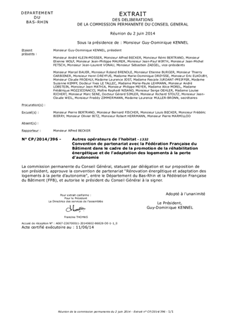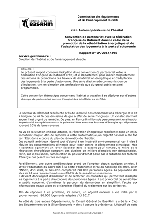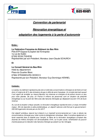 Le présent rapport concerne l'adoption d'une convention de partenariat entre la Fédération Française du Bâtiment (FFB) et le Département pour mener conjointement des actions de promotions des travaux de réhabilitation énergétique et d'adaptation des logements à la perte d'autonomie. Une série d'actions de communication ou d'incitation, tant en direction des professionnels que du grand public est ainsi programmée. Cette convention thématique concernant l'habitat a vocation à se déployer sur d'autres champs de partenariat comme l'emploi des bénéficiares du RSA.
