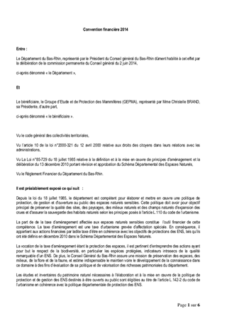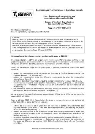 Dans le cadre du Schéma Départemental des Espaces Naturels, le Département a identifié un enjeu fort autour de la connaissance et de la préservation de la faune et de la flore, qui constituent des indicateurs des milieux naturels. D’autres acteurs partagent cet objectif et ont proposé un partenariat au Département. Ainsi il est proposé d’examiner les modalités de financement avec le Groupe d’étude et de protection des mammifères d’Alsace (GEPMA).
