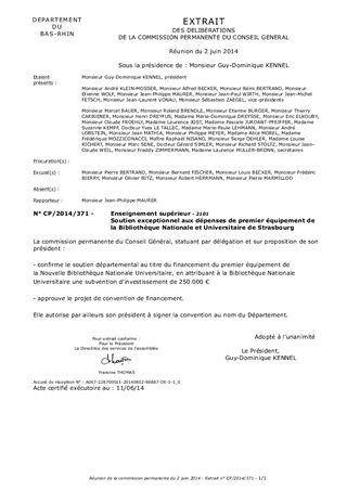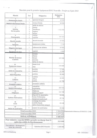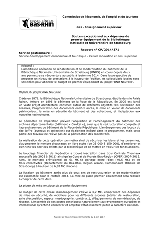 L'ambitieuse opération de réhabilitation et de modernisation du bâtiment de la Bibliothèque Nationale Universitaire de Strasbourg (BNUS) en cours depuis deux ans permettra sa réouverture au public à l'automne 2014. Dans la perspective de proposer un niveau de prestations à la hauteur de l'édifice, les collectivités locales sont sollicitées pour abonder le budget de premier équipement du projet 'BNU Nouvelle'.