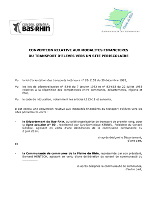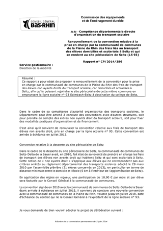 Ce rapport a pour objet de proposer le renouvellement de la convention pour la prise en charge par la communauté de communes de la Plaine du Rhin des frais de transport des élèves non ayants droits du transport scolaire, car domiciliés et scolarisés à Seltz, afin qu’ils puissent rejoindre le site périscolaire de cette même commune en empruntant la ligne scolaire n° 93 Salmbach-Seltz à destination du collège de Seltz.