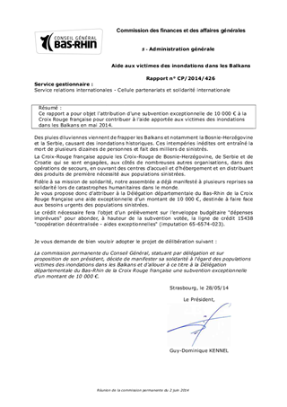 Ce rapport a pour objet l'attribution d'une subvention exceptionnelle de 10 000 € à la Croix Rouge française pour contribuer à l'aide apportée aux victimes des inondations dans les Balkans en mai 2014.