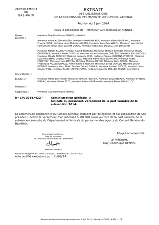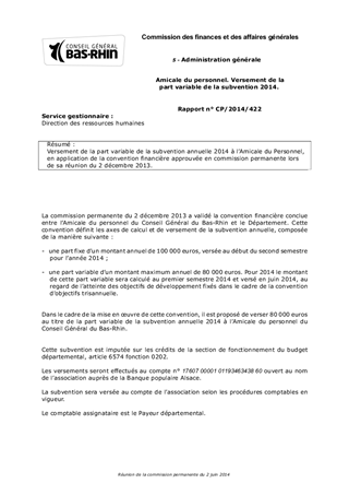 Versement de la part variable de la subvention annuelle 2014 à l’Amicale du Personnel, en application de la convention financière approuvée en commission permanente lors de sa réunion du 2 décembre 2013.