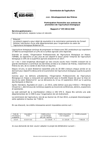 Le présent rapport a pour objet de soumettre à la commission permanente du Conseil Général l'attribution d'une aide départementale pour l'organisation du salon de l'agriculture biologique Biobernai'14.