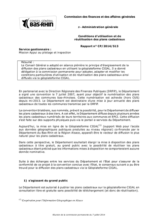 Le Conseil Général a adopté en séance plénière le principe d’élargissement de la diffusion des plans cadastraux en utilisant la géoplateforme CIGAL. Il a donné délégation à la commission permanente pour adopter, adapter et modifier les conditions particulières d’utilisation et de réutilisation des plans cadastraux ainsi diffusés via la géoplateforme CIGAL.