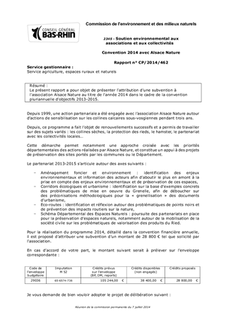 Le présent rapport a pour objet de présenter l'attribution d'une subvention à l'association Alsace Nature au titre de l'année 2014 dans le cadre de la convention pluriannuelle d'objectifs 2013-2015.