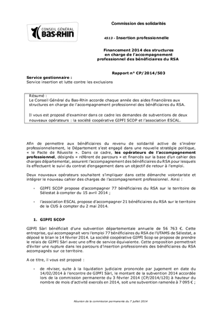 Le Conseil Général du Bas-Rhin accorde chaque année des aides financières aux structures en charge de l'accompagnement professionnel des bénéficiaires du RSA. Il vous est proposé d’examiner dans ce cadre les demandes de subventions de deux nouveaux opérateurs : la société coopérative GIPFI SCOP et l’association ESCAL.