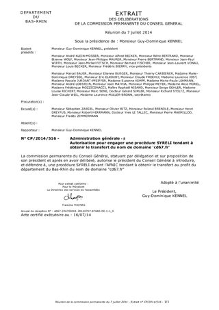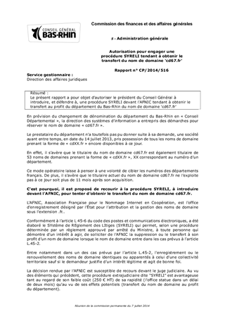 Le présent rapport a pour objet d'autoriser le président du Conseil Général à introduire, et défendre à, une procédure SYRELI devant l'AFNIC tendant à obtenir le transfert au profit du département du Bas-Rhin du nom de domaine 'cd67.fr'