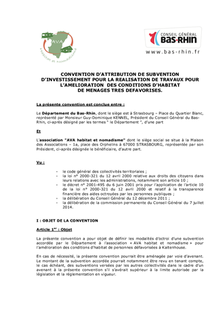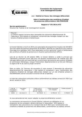 Le présent rapport concerne deux demandes de subvention départementale de l'association 'AVA habitat et nomadisme' concernant des ménages résidant sur des terrains d'habitat précaire à Kaltenhouse.
