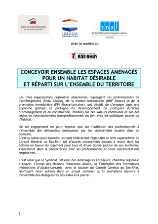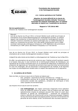 Lors de sa réunion du 25 juin 2012, le Conseil Général avait validé les principes et orientations d'une charte départementale de l'aménagement durable. Le présent rapport vise à présenter le texte définitif de la charte de l'aménagement durable intitulée 'Concevoir ensemble les espaces aménagés pour un habitat désirable et réparti sur l'ensemble du territoire' qui a été signée conjointement avec le SNAL (syndicat nationale des aménageurs lotisseurs), la FPI (fédération des promoteurs immobiliers) et l'UMF (Union des Maison Françaises) le 27 mai dernier.