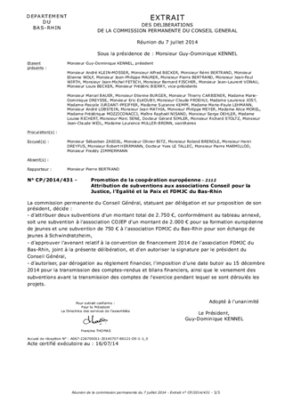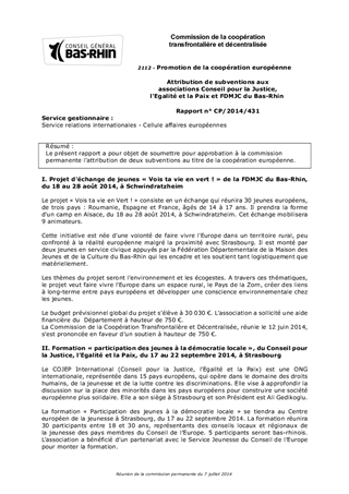 Attribution de subventions aux associations Conseil pour la Justice, l'Egalité et la Paix et FDMJC du Bas-Rhin
