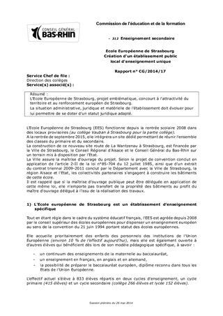 Ecole Européenne de Strasbourg Création d'un établissement public local d'enseignement unique