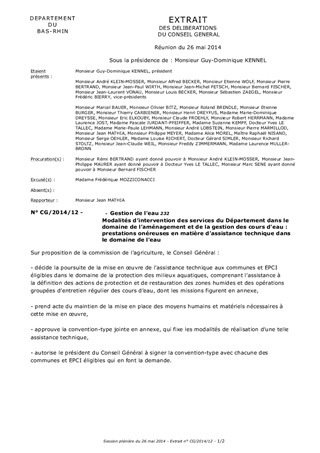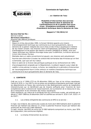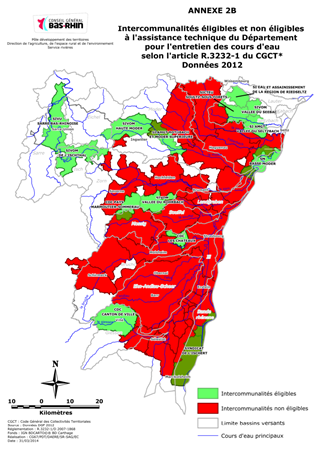Depuis le milieu des années 1990, le Conseil Général apporte une mission d’accompagnement technique aux communes ou à leurs groupements, dans le domaine de la gestion intégrée des cours d’eau et des milieux aquatiques à l’échelle de leur bassin versant. Ces missions visent principalement l’animation des schémas d’aménagement et de gestion des bassins versants (SAGEECE et SAGE), ainsi que l’appui technique aux maîtres d’ouvrage locaux pour la définition, la mise en œuvre et le suivi des travaux fluviaux. Réalisées dans un cadre conventionné et payant, ces missions sont actuellement fournies sans distinction à toutes les collectivités territoriales bas-rhinoises qui en font la demande, quel que soit leur statut. Dans le cadre de la révision des politiques publiques et du renforcement de l’offre d’accompagnement proposée par le Département, le présent rapport a pour objet de redéfinir et de préciser la nature, la forme, les modalités et le périmètre d’intervention de l’accompagnement fourni à titre onéreux en matière d’assistance technique aux communes et à leurs groupements dans le domaine de l’eau.