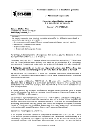 Le présent rapport a pour objet de compléter et modifier les délégations données à la commission permanente en matière : - de règlement amiable des différends ou des litiges relatifs aux marchés publics, - d’adhésion à une centrale d’achats, - de procédure SYRELI, - et de contrats de louage de choses.