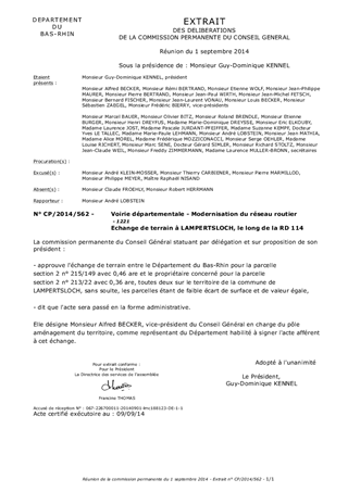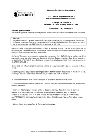 Le présent rapport a pour objet un échange de terrain entre un propriétaire riverain et le Département du Bas-Rhin dans le cadre d'une régularisation foncière sur le territoire de la commune de LAMPERTSLOCH, le long de la RD 114.