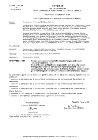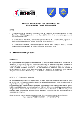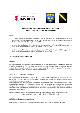 Ce rapport a pour but de déléguer la compétence d'organisation d'une ligne de transport scolaire aux communes de Bolsenheim et d'Uttenheim, et de Wolxheim et Avolsheim, de proposer la conclusion d’une convention de financement entre la communauté de communes de la Plaine du Rhin et le Conseil Général afin de prendre en compte le surcoût lié à la desserte des sites périscolaires de Niederroedern et de Trimbach, et d'approuver la convention entre le Conseil Général des Vosges et le Conseil Général du Bas-Rhin pour le transport des élèves de Saales scolarisés à Provenchères sur Faves.