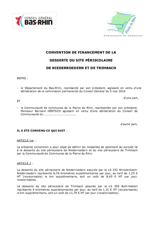 Convention de délégation d'organisation de deux lignes de transports scolaires, convention de financement entre la communauté de communes de la Plaine du Rhin, et convention pour le transport scolaire avec le conseil Général des Vosges.