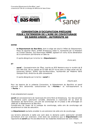 Lors de son assemblée plénière du 24 juin 2013, le Département a décidé de favoriser les mobilités alternatives à la voiture individuelle à travers l'adoption d'un schéma départemental des aires de covoiturage. Ce schéma fixe notamment l'objectif d'étendre l'aire de SARRE-UNION aménagée en 1998 et dont la capacité actuelle de 15 places s'avère insuffisante. Le projet d'extension prévoit la création de 49 places supplémentaires d'ici la fin d'année 2014. L'aire de covoiturage étant située sur des parcelles attenantes au domaine public autoroutier concédé à Sanef, une convention d'occupation précaire pour l'extension de l'aire de covoiturage de SARRE-UNION doit être conclue entre le Département et Sanef.