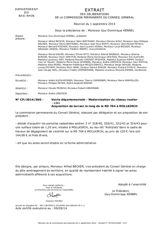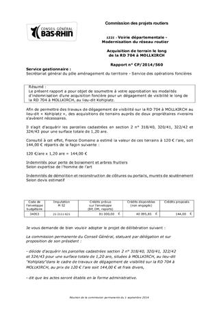 Le présent rapport a pour objet de soumettre à votre approbation les modalités d'indemnisation d'une acquisition foncière pour un dégagement de visibilité le long de la RD 704 à MOLLKIRCH, au lieu-dit Kohlplatz.
