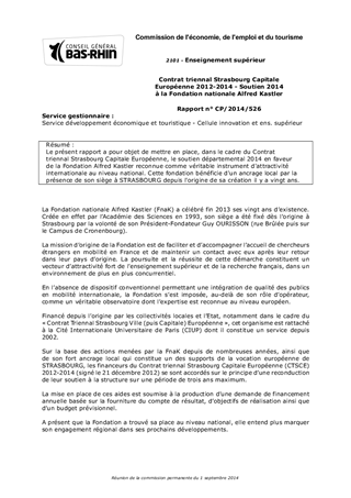 Le présent rapport a pour objet de mettre en place, dans le cadre du Contrat triennal Strasbourg Capitale Européenne, le soutien départemental 2014 en faveur de la Fondation Alfred Kastler reconnue comme véritable instrument d'attractivité internationale au niveau national. Cette fondation bénéficie d'un ancrage local par la présence de son siège à STRASBOURG depuis l'origine de sa création il y a vingt ans.