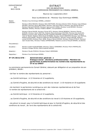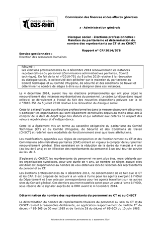 Les élections professionnelles du 4 décembre 2014 renouvelleront les instances représentatives du personnel (Commissions administratives paritaires, Comité technique). Du fait de la loi n°2010-751 du 5 juillet 2010 relative à la rénovation du dialogue social, la collectivité doit délibérer sur le maintien du paritarisme au Comité technique et au Comité d'hygiène, de sécurité et des conditions de travail et déterminer le nombre de sièges à élire ou à désigner dans ces instances.