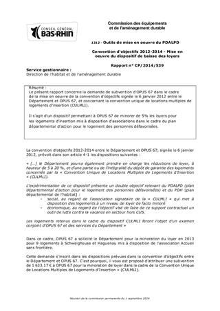 Le présent rapport concerne la demande de subvention d'OPUS 67 dans le cadre de la mise en oeuvre de la convention d'objectifs signée le 6 janvier 2012 entre le Département et OPUS 67, et concernant la convention unique de locations multiples de logements d'insertion (CULMLI). Il s'agit d'un dispositif permettant à OPUS 67 de minorer de 5% les loyers pour les logements d'insertion mis à disposition d'associations dans le cadre du plan départemental d'action pour le logement des personnes défavorisées.