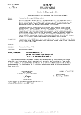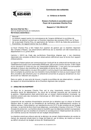 Le présent rapport porte à la connaissance de l'organe délibérant la synthèse de l'examen de gestion conduit par la Chambre régionale des comptes (CRC) sur le Foyer de la jeunesse Charles Frey, en application de l'article L 243-5 du Code des juridictions financières. Ce rapport donne lieu à un débat.