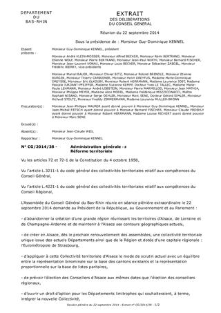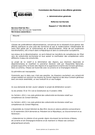 Réforme territoriale Resumé Pièces jointes Délibération Rapport Assemblée : Conseil General Date : 22/09/2014 Rapporteur : Monsieur Guy-Dominique KENNEL Collectivité : Conseil départemental du Bas-Rhin Direction : Pôle ressources Service : Direction des services de l'assemblée Domaine : Non renseigné Commission : M - Commission des finances et des affaires générales